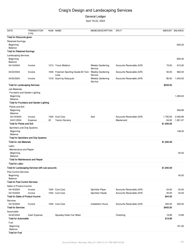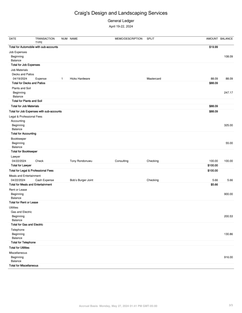 As per the example report below, the General Ledger report shows a viewer the detailed line item entries that occurred within each account in your entire Chart of Accounts. So, for example, if you purchased a job material from a hardware store, then the General Ledger report will show the credit card activity AND the corresponding expense account activity for this one transaction.